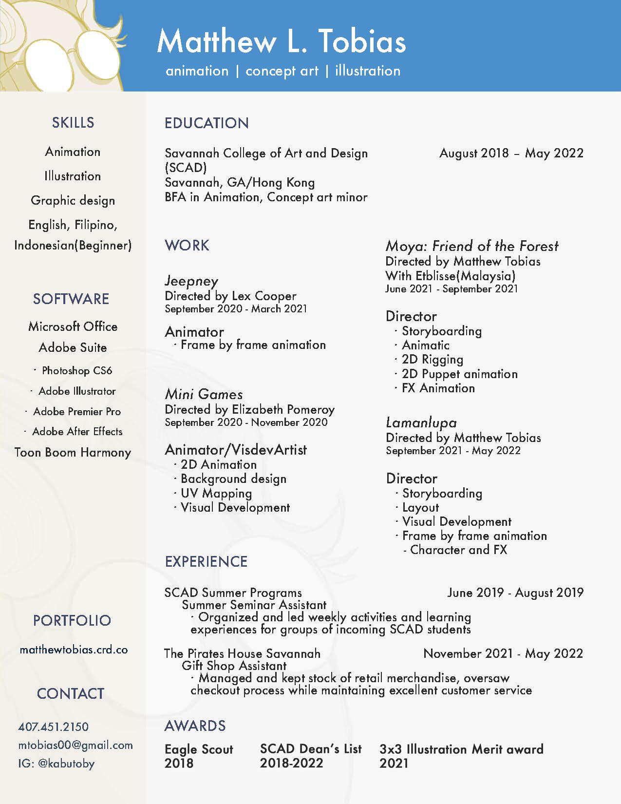 I was born in suburban Florida, and I also lived in the Philippines for a while. Sometimes I tell people I'm from there instead because I think it sounds cooler.Besides being an animator, I'm also an award-winning illustrator and watercolorist. Having lived in the Philippines and Hong Kong, as well as Bermuda, I draw from a diverse range of influences and experiences that have shaped me into who I am.I love gundam, weird movies, fancy coffee, and walking around. I also love music; I'm proficient in playing the recorder and otamatone. If you know any good bands, let me know!
