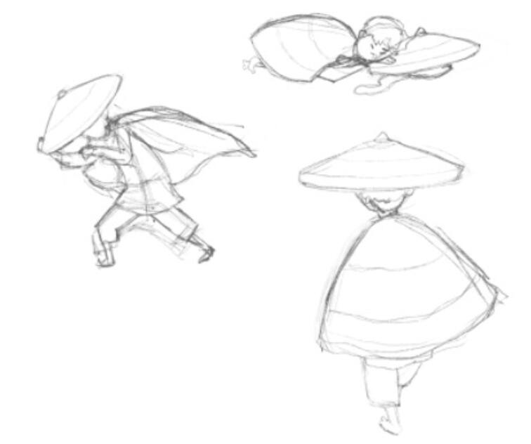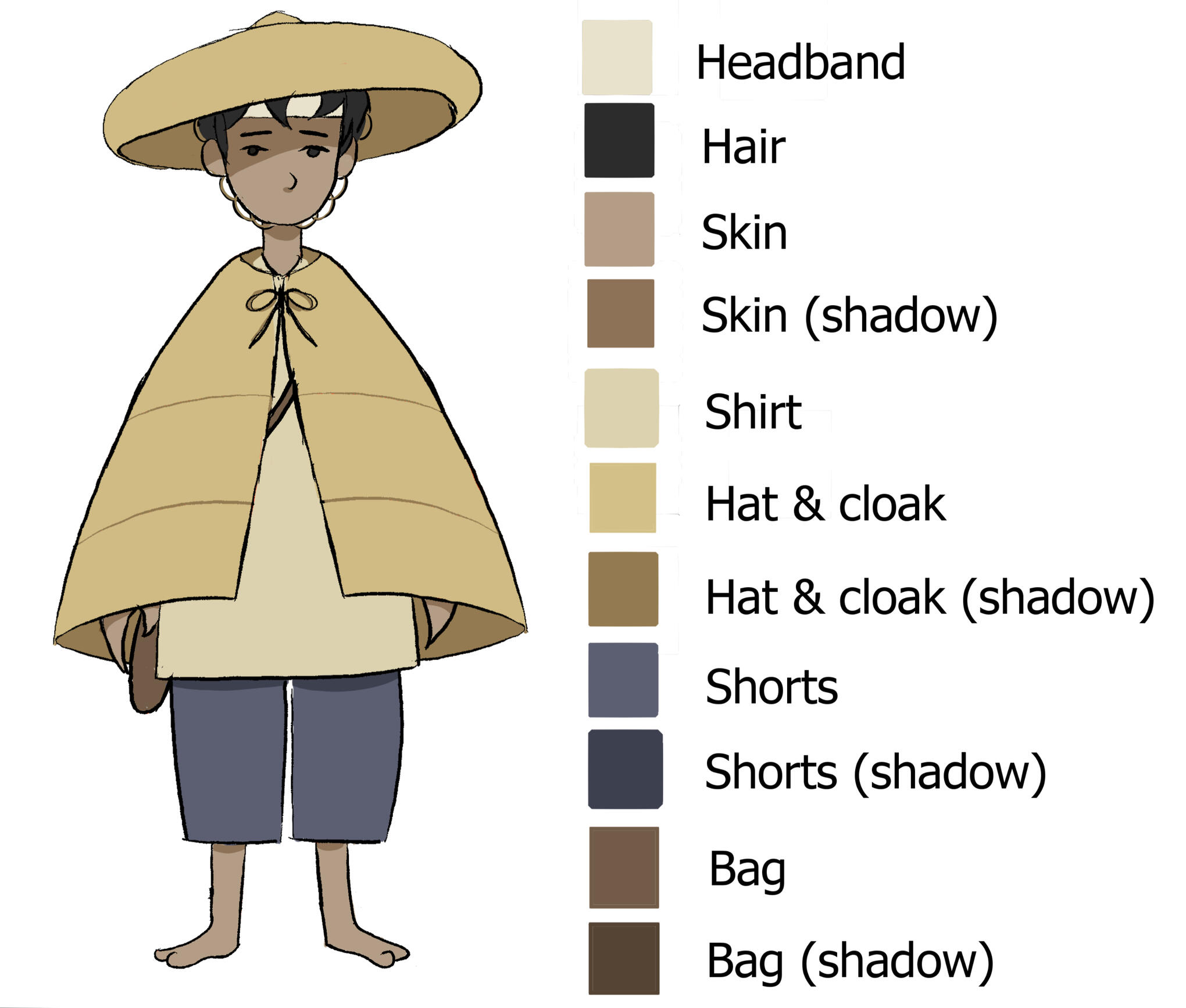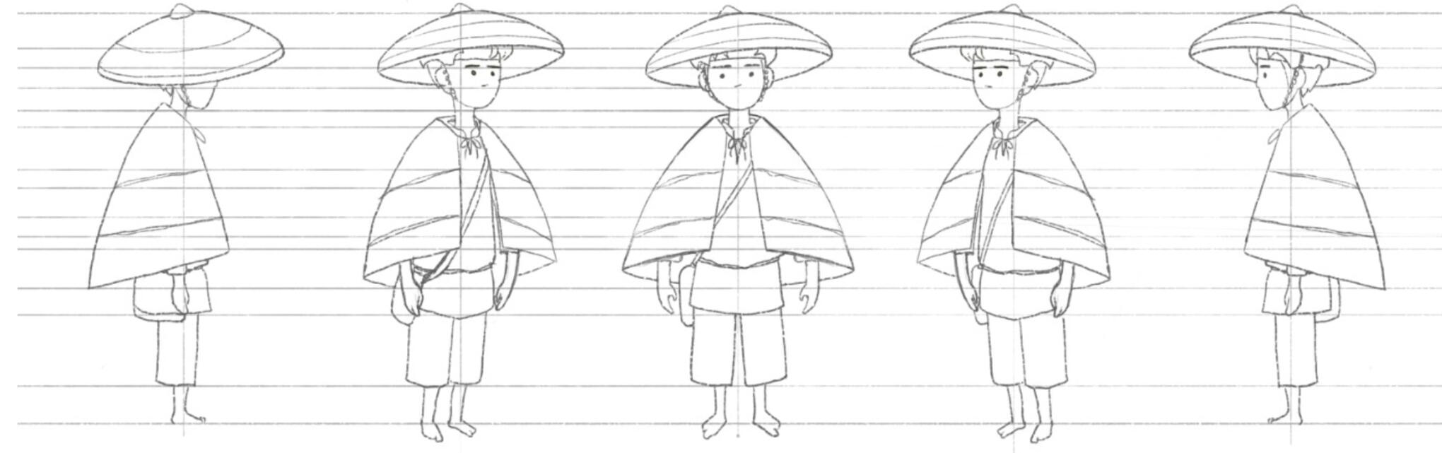 The main character of the film is a member from a lowland society, and wears post-colonial mid 1800s attire.He has a simple hat and cloak to protect from the weather, and a bag for traveling.Despite his contemporary clothing, he is barefoot, suggesting a simple and hard working lifestyle.